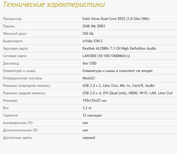 Неттоп оснащен двухъядерным процессором Intel Atom D525 с тактовой частотой 1,8ГГц, его производительности хватит для ряда повседневных задач, включая и запуск компьютерных игр. И это при условии, что энергопотребление CPU составляет всего 13 Вт. Конечно, это стало возможным благодаря «связке» вместе с графической платформой NVIDIA ION-2.