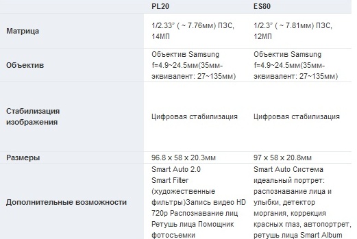 Samsung PL20 снабжен 14МП матрицей, 27-мм широкоугольным объективом с 5-кратным оптическим зумом, а также функцией записи HD-видео. ES80 оснащен 2,4-дюймовым ЖК дисплеем для удобного управления камерой. Фотоаппарат является отличным выбором для покупателей, которым нужна качественная камера по доступной цене.