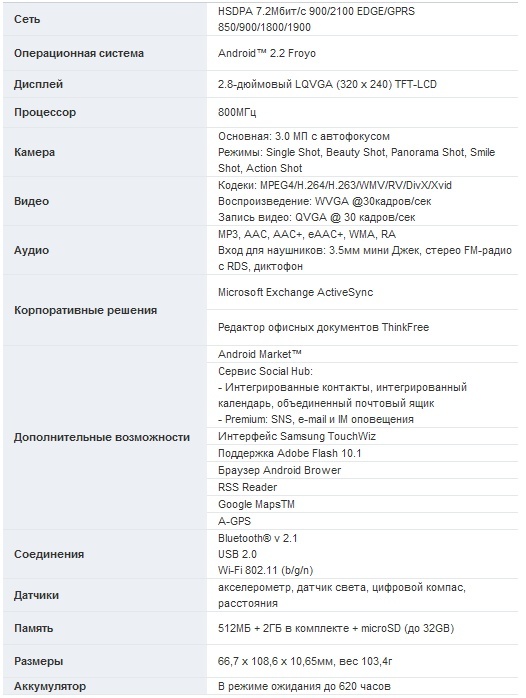 С системой двойного ввода Samsung Galaxy Pro, состоящей из тачскрина и QWERTY-клавиатуры, пользователь имеет под рукой все,что нужно для немедленного реагирования на любые сообщения и запросы. Новый смартфон предоставляет пользователям возможность делиться любым контентом с друзьями, знакомыми и коллегами. С этой целью он оснащен 3.0 МП камерой для съемки фотографий и видео. Прежде чем загрузить ролики и изображения в сеть, их можно просмотреть на ярком, четком 2.8-дюймовом дисплее. А поддержка WiFi и Bluetooth предоставляют постоянное соединение и готовность к обмену данными.