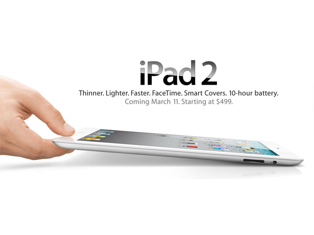 Несколько часов назад Apple в лице самого Стива Джобса анонсировали свою новинку — второе издание прошлогоднего хита: планшетного компьютера iPad. iPad 2 стал более мощным (оборудован двухядерным процессором и продвинутой графической системой), тонким и легким, а также обрел функциональность полноценного HD-видеопроигрывателя. Продажи в США начнутся 11 марта, а цена останется прежней.